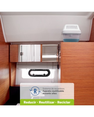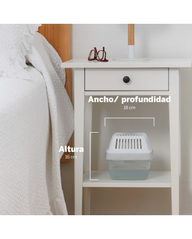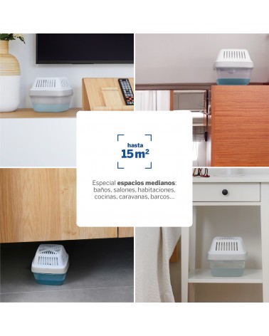 Su diseño compacto y discreto se integra en cualquier estancia de hasta 15 m², mientras que su depósito de seguridad antigoteo asegura un uso limpio y seguro en interiores. Este sistema funciona sin electricidad y sin necesidad de instalación, ofreciendo una solución silenciosa y eficiente para mantener el ambiente seco y saludable.