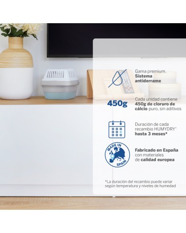 El pack HUMYDRY Premium Plus 450g gris ofrece una solución completa para controlar el exceso de humedad en habitaciones medianas. Incluye un aparato antihumedad reutilizable y 3 recambios neutros de 450g.
