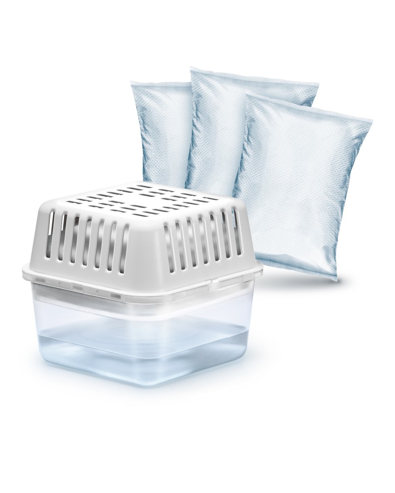 Pack completo: Incluye el aparato deshumidificador + 3 recambios de 250g.