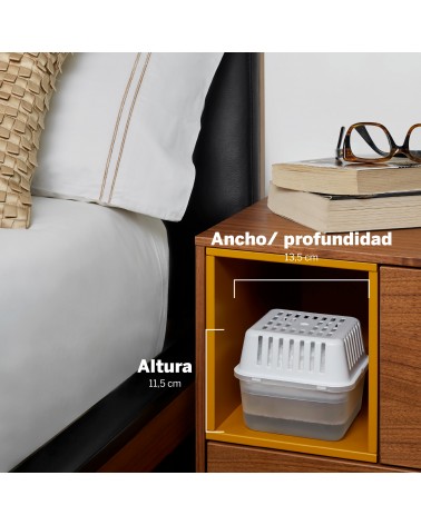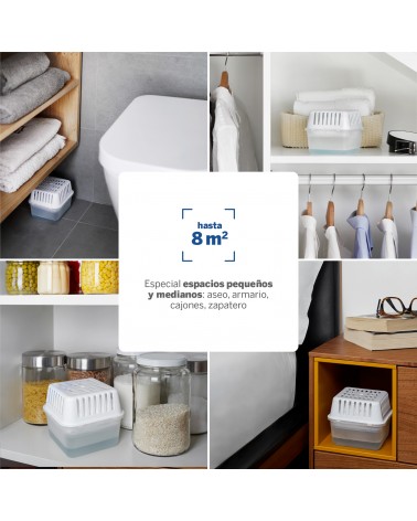 El sistema de absorción transforma la humedad en líquido, evitando la formación de moho, manchas y malos olores. Su diseño compacto y portátil permite colocarlo en cualquier lugar: baños, armarios, cocinas, dormitorios o incluso vehículos recreativos.