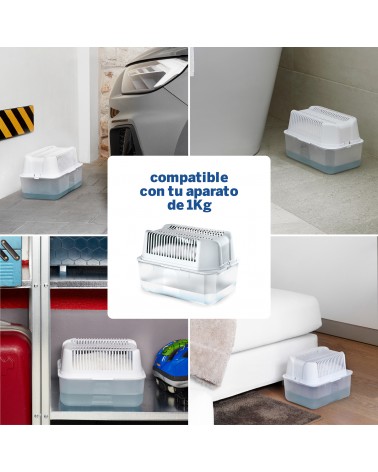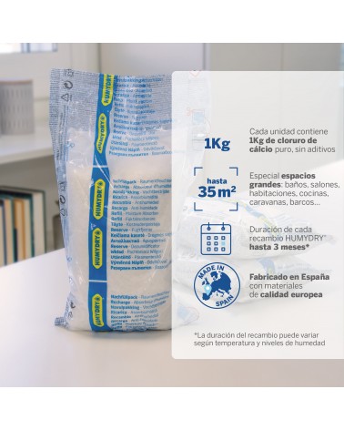 Un recambio de 1 kg es adecuado para superficies de hasta 35 m² y tiene una duración aproximada de 1 a 3 meses, dependiendo de la humedad y la temperatura de la estancia.
