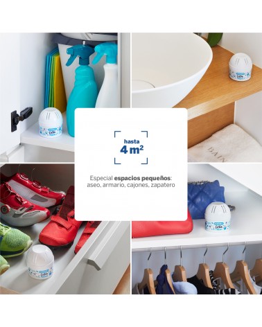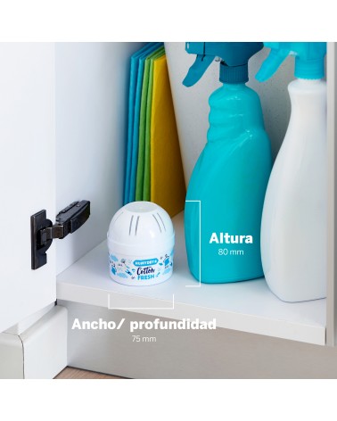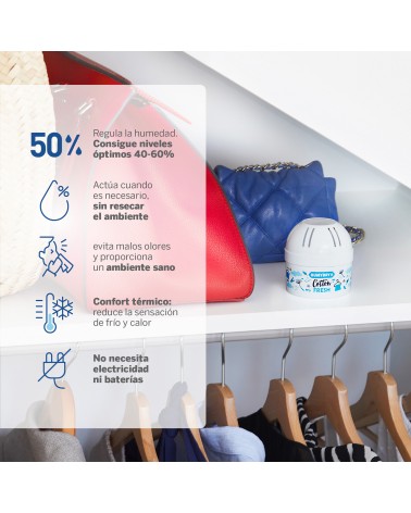 HUMYDRY® Mini 75g es un práctico deshumidificador de doble función: absorbe la humedad por condensación y aporta un agradable aroma a cotton que refresca tus espacios. Gracias a su tamaño reducido, resulta ideal para armarios, cajones, zapateros, taquillas o aseos, donde ayuda a proteger prendas y objetos sensibles de la humedad y los malos olores.