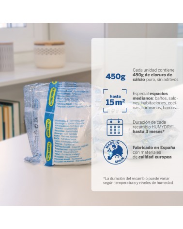 El lote de 4 recambios antihumedad HUMYDRY® de 450 g está diseñado para controlar el exceso de humedad en espacios de hasta 15 m², como baños, dormitorios, trasteros o cocinas. Cada recambio contiene cloruro de calcio en granulado, que absorbe la humedad ambiental y la convierte en líquido, almacenado de forma segura en el depósito del deshumidificador.